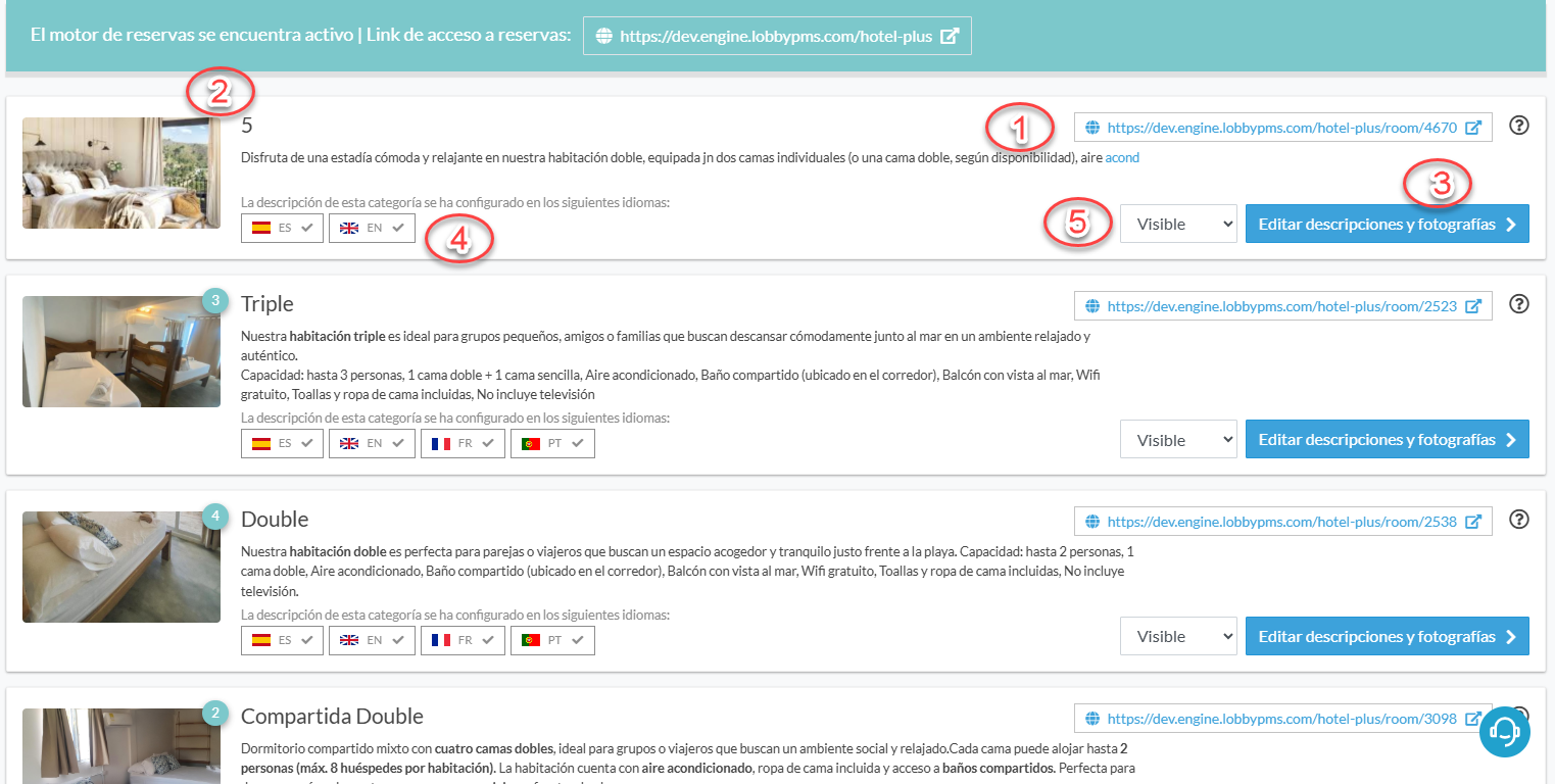 Agregue las fotos de sus habitaciones disponibles para la venta, edite las descripciones en distintos idiomas y cambie el orden del listado de habitaciones en el motor de reservas.