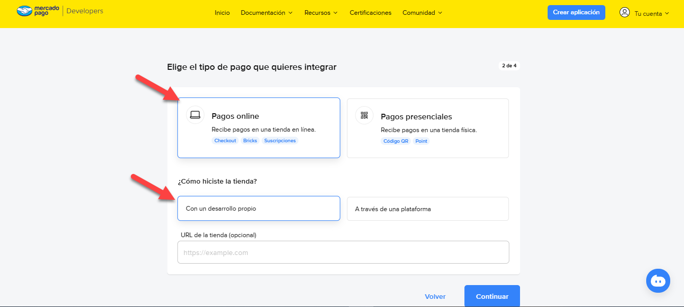 👉 4-Ahora selecciona "Pagos online" y "Con un desarrollo propio". No es necesario colocar la URL de la tienda. Das clic en continuar.