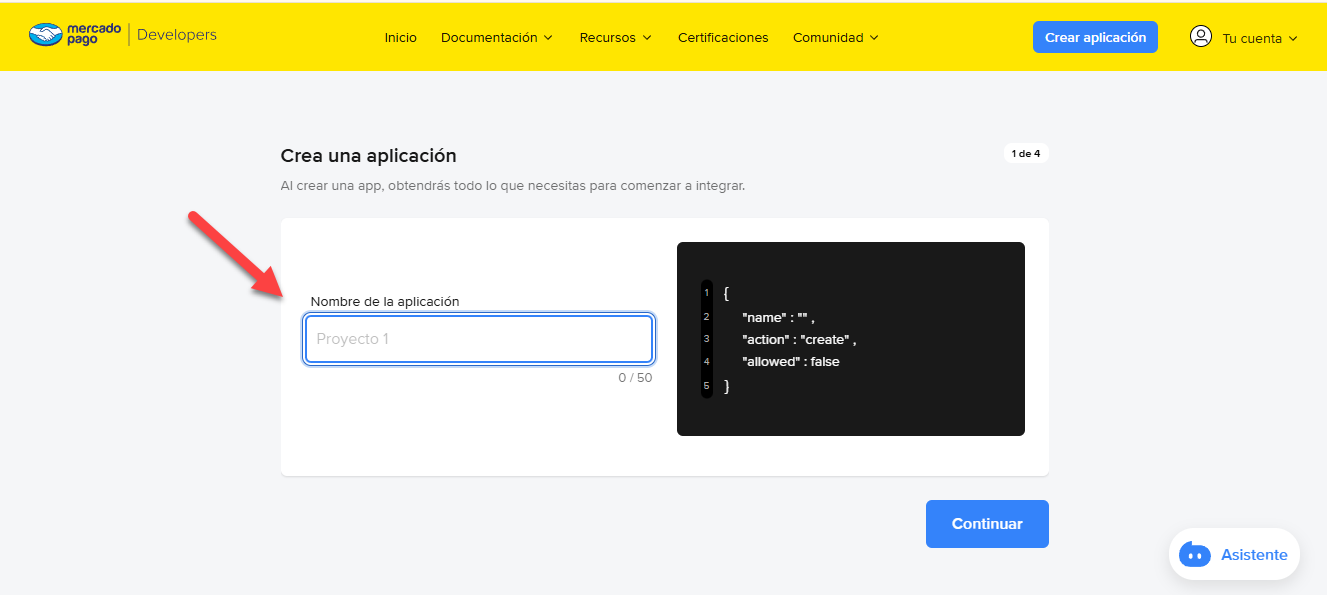 👉 3- Coloca el nombre de la aplicación y das clic en continuar. Puede ser el nombre de tu hotel.