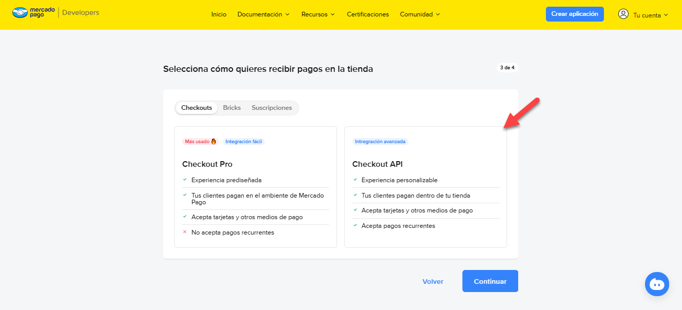 👉 5- Selecciona la opción "Checkout API" y das clic en continuar.