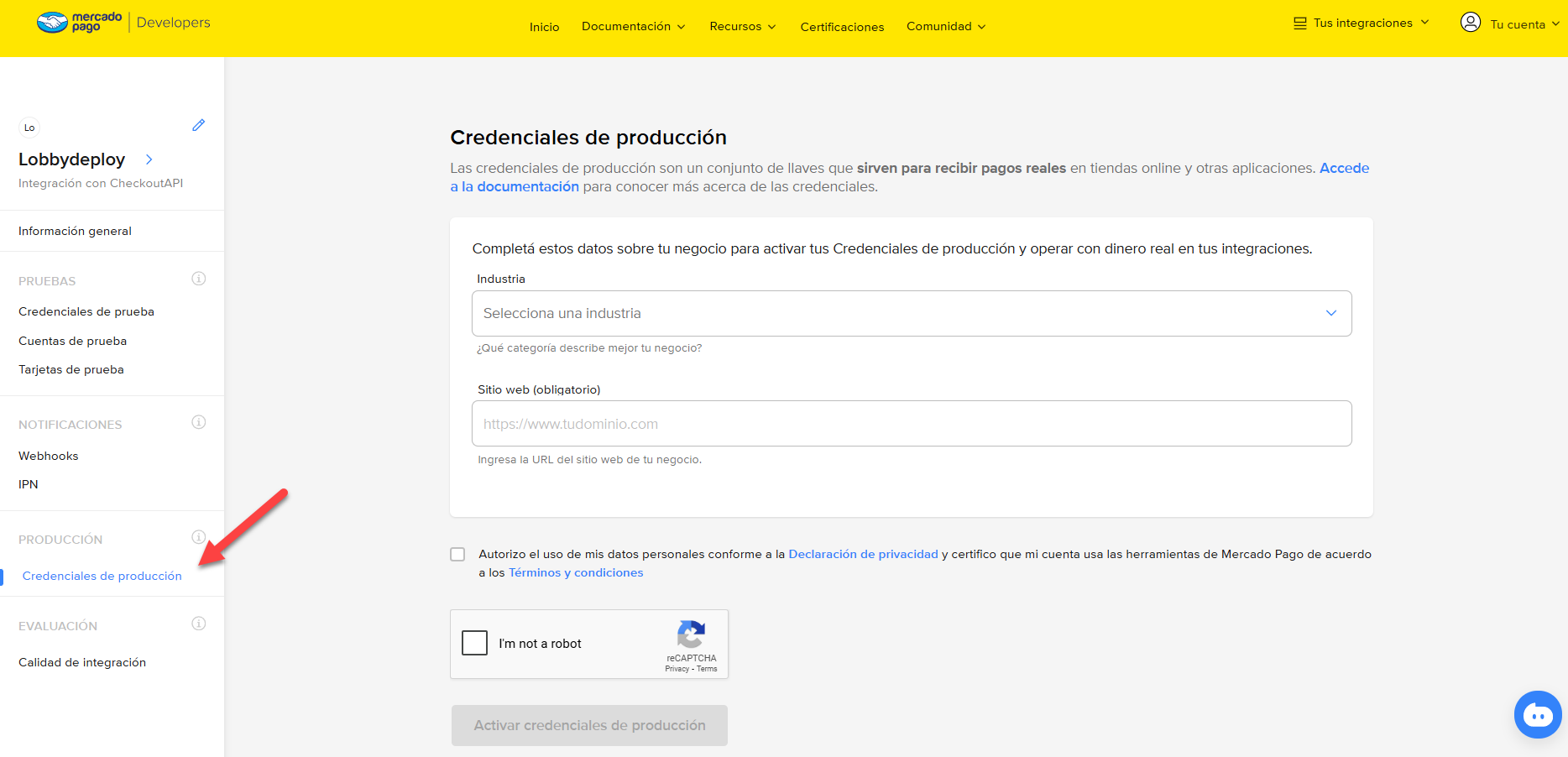 👉 8- Una vez creada la aplicación, en el menú lateral haga clic en "Credenciales de producción". Allí seleccionas la industria y agregas la URL de tu establecimiento. Das clic en "Activar credenciales de producción" y aparecerá un aviso que informa que las credenciales estan listas para usarse.