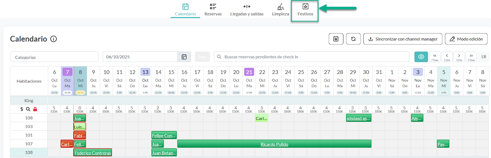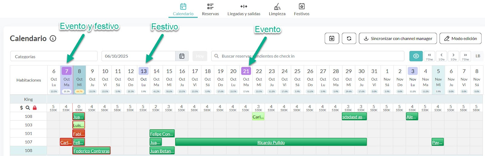 En el calendario de reservas podrás identificar de forma rápida si en un día existe un evento, un festivo o si coinciden ambos. Esto permitirá anticipar la demanda y tomar mejores decisiones en la gestión de tarifas y disponibilidad.