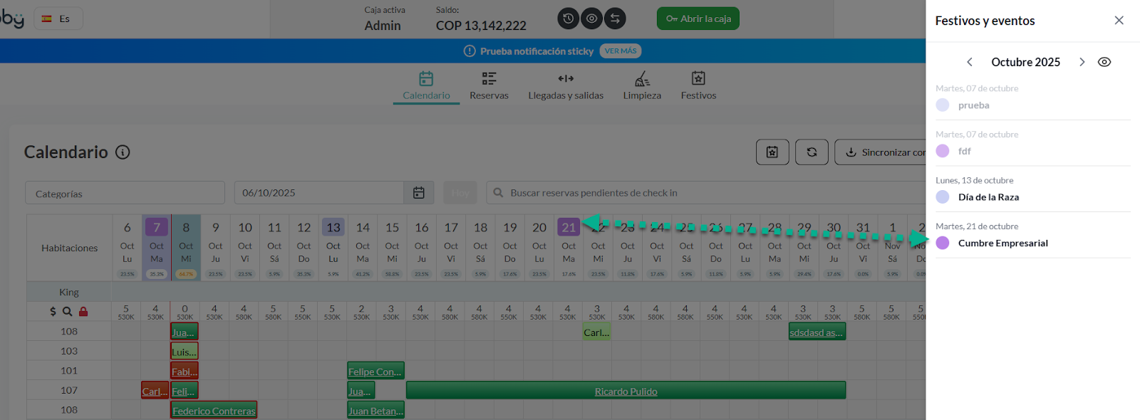 - Dar clic sobre un día marcado (festivo o evento) directamente en el calendario de reservas.