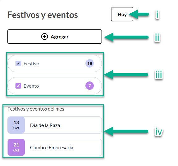 Además, cuentas con un ícono en forma de flecha diagonal que te permite acceder directamente a la interfaz completa de Eventos y Festivos, donde podrás gestionarlos en detalle (agregar, editar o eliminar).