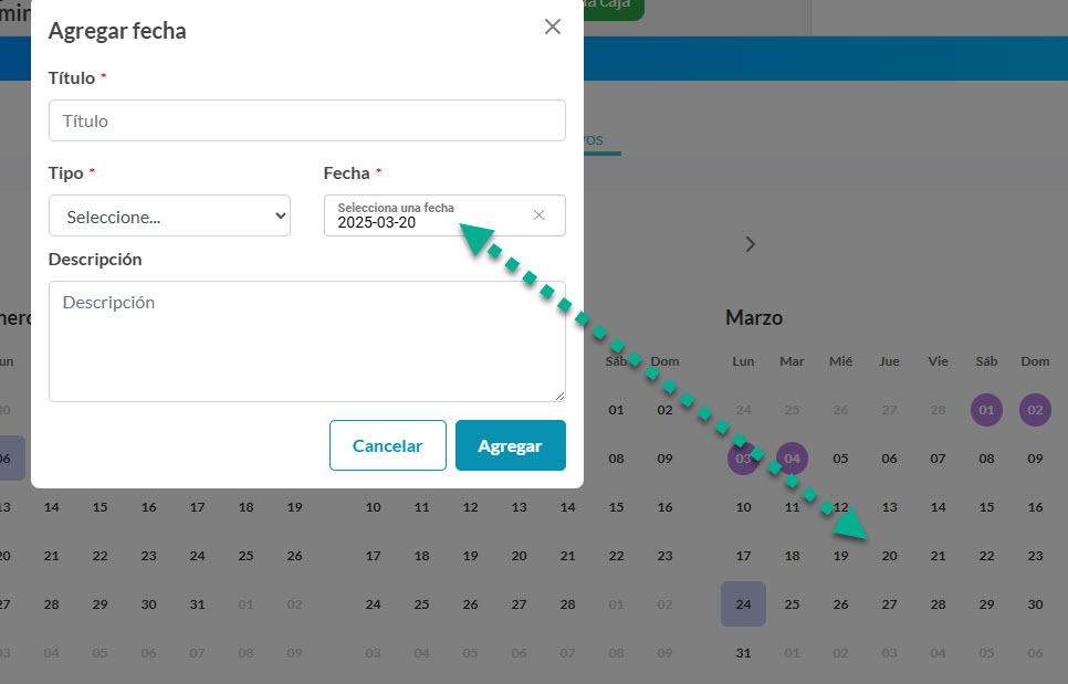 Gestionar fechas directamente en el calendario: al dar clic sobre un día podrás agregar, editar o eliminar un festivo o evento.