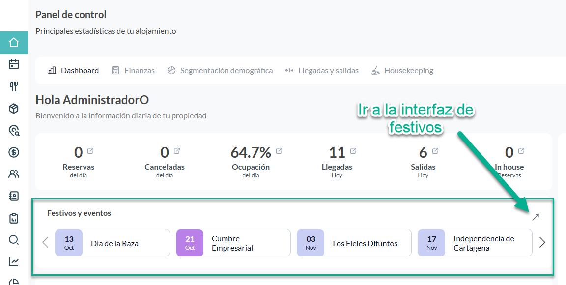 En el Dashboard encontrarás una línea horizontal que despliega los eventos y festivos próximos.