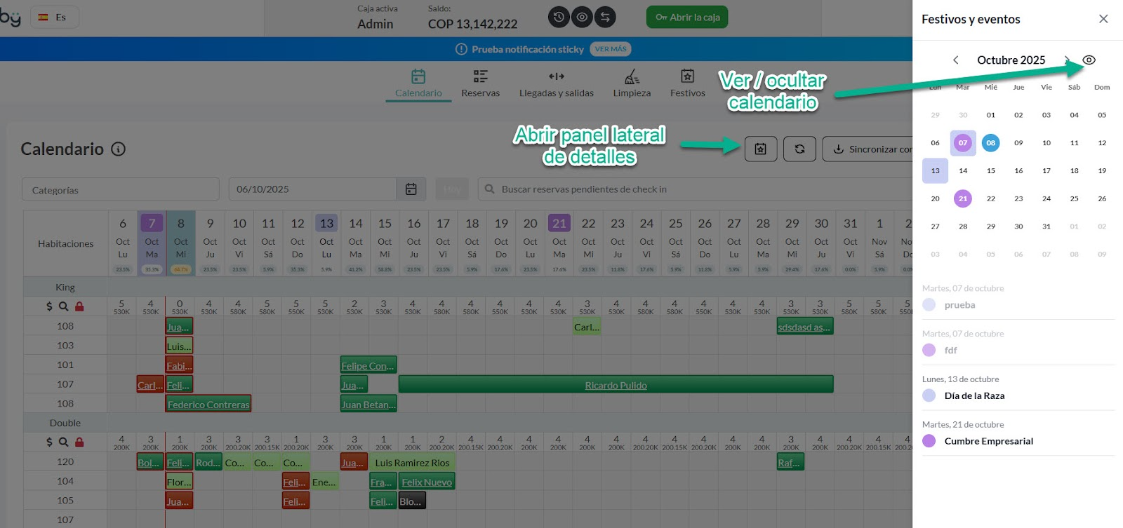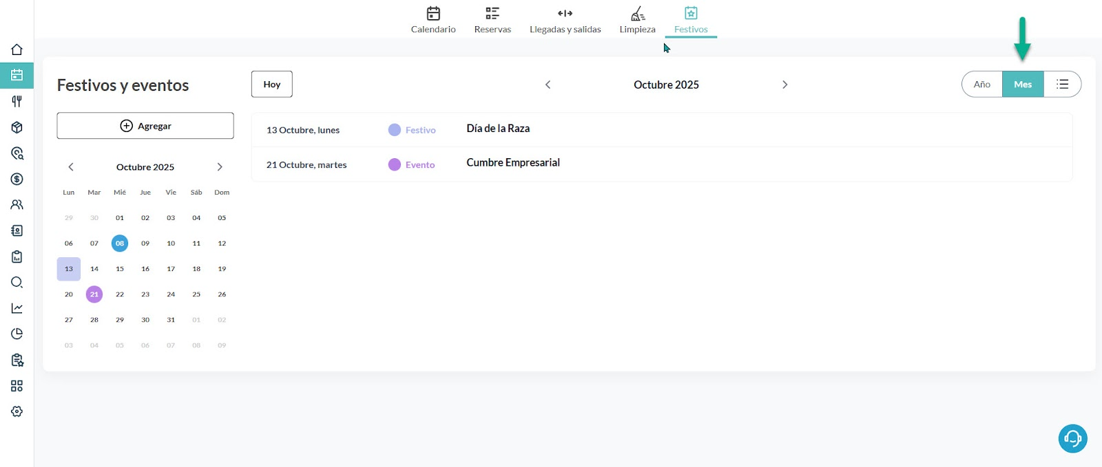 Además de identificar los festivos y eventos directamente en el calendario de reservas, también puedes visualizar un panel lateral de detalles que te permitirá tener una lista más organizada y una vista mensual.