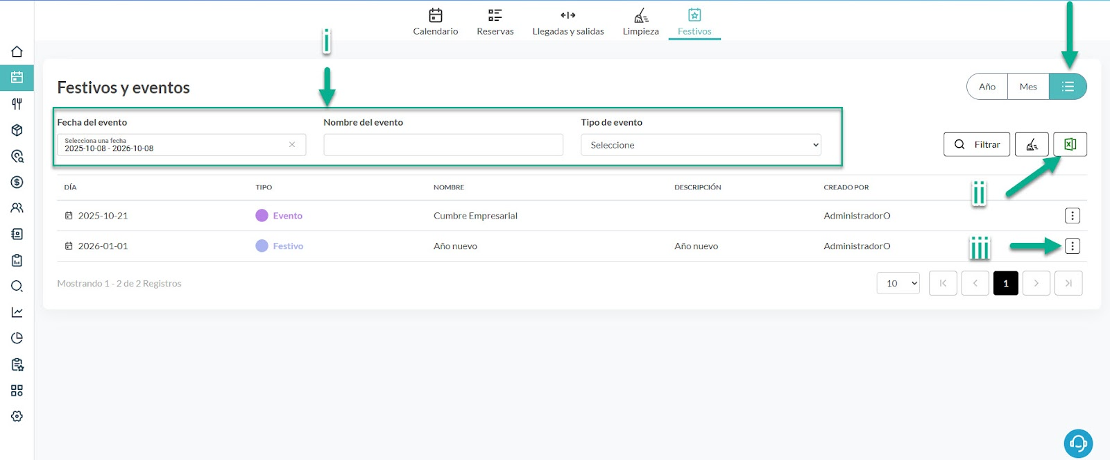 En esta vista podrás consultar de manera ordenada todos los eventos y festivos creados en tu cuenta. La información se presenta en una tabla con los principales detalles de cada fecha, como el día, tipo de evento, nombre, descripción y quién lo creó.