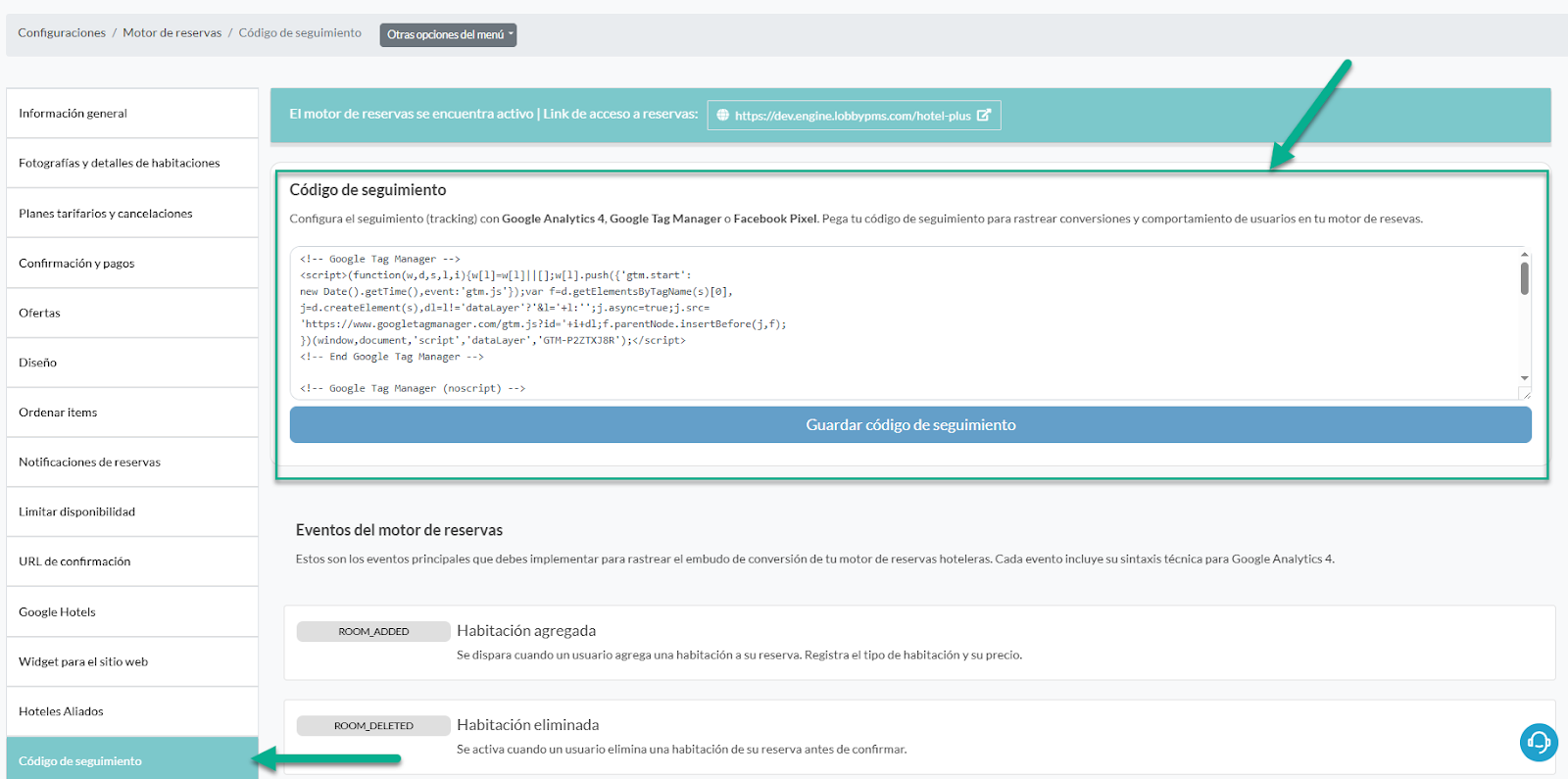 📌 Importante: Después de guardar, el código se insertará automáticamente en el motor de reservas, permitiendo rastrear conversiones y el comportamiento de los usuarios.