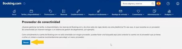 Posterior a la validación de identidad, Booking.com nos presenta la vista de proveedor de conectividad, encontrarás una descripción de proveedor de conectividad, channel manager y un botón que indica “Buscar”. Debes hacer click en este botón para buscar a Lobby como proveedor: