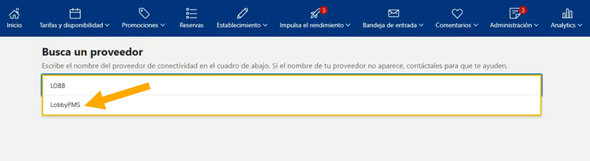 Al darle click en “Buscar” va a redirigir a otra vista la cual nos muestra un renglón para buscar el proveedor, en este caso debemos escribir el nombre de nuestro proveedor que en este caso es LobbyPMS, seleccionando la opción que nos da debajo: