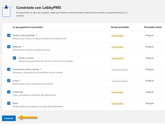 Al escoger a LobbyPMS como proveedor, mostrará la interfaz donde encontrarás lo que gestionará el proveedor, en esta interfaz en la parte inferior izquierda está ubicado el botón de “Conectar” al cual le darás click: