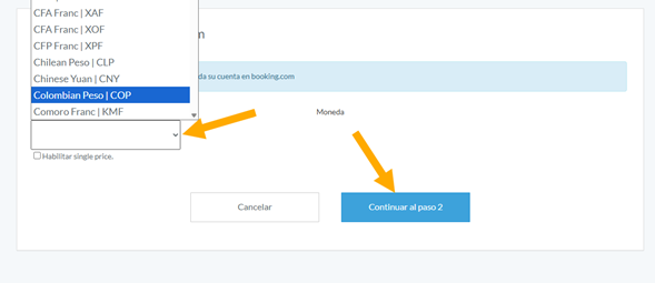 En este paso debes seleccionar la moneda con la que trabajas en Booking.com y le das en continuar al paso 2 sin activar la opción de “Habilitar Single Price”: