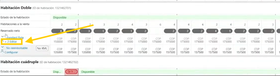 Validar las tarifas que se reciben en Booking.com, para ello debes tener en cuenta que si en Lobby tienes tarifas entre ocupación (ejemplo: $100 USD para 1 persona, para 2 personas $120 USD) debes realizar derivaciones de precios dentro del calendario de Booking.com, para ello ingresas al calendario de Booking.com y en el costado izquierdo ubicas el nombre del plan, debajo te da la ocupación y para editar(x2 Editar)
