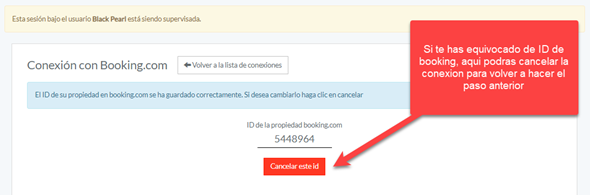 El siguiente paso te muestra la interfaz con el ID de la propiedad con la opción para cancelar la conexión (en dado caso sea errado el ID de Booking.com) o para iniciar conexión en la parte de abajo: