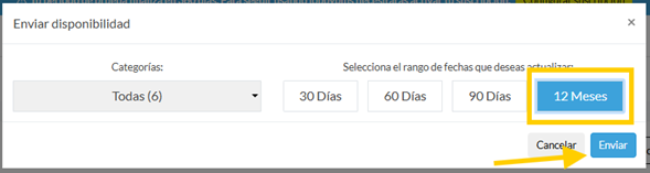 Al culminar recomendamos enviar disponibilidad desde el calendario de Lobby hacía Booking.com, para esto debes dar clic en sincronizar con Channel Manager y enviar disponibilidad de 12 meses: