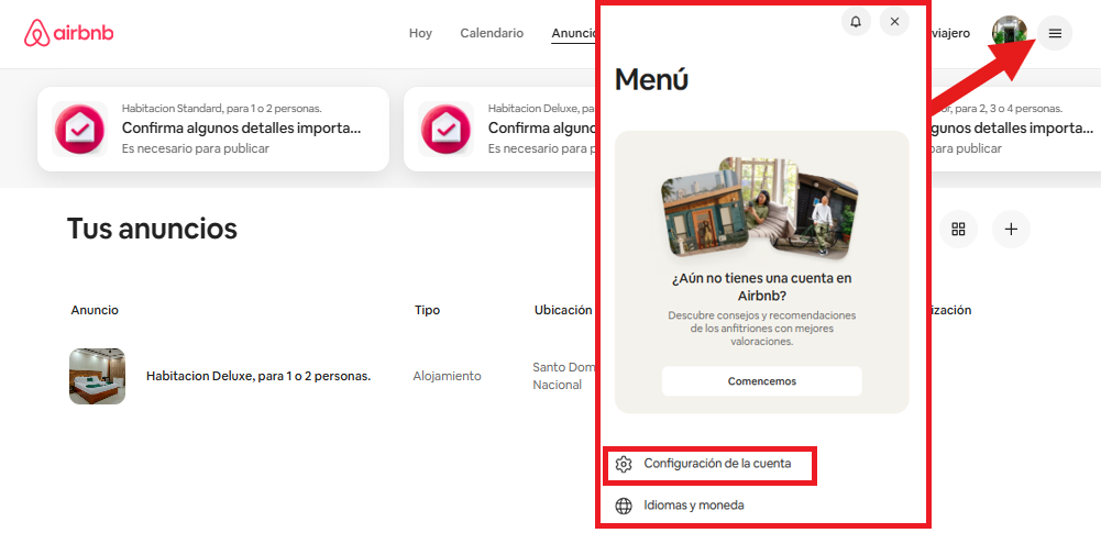 Ingresa a Configuración de la cuenta para validar y gestionar los servicios de la propiedad en Airbnb, se encuentra en la parte superior derecha: