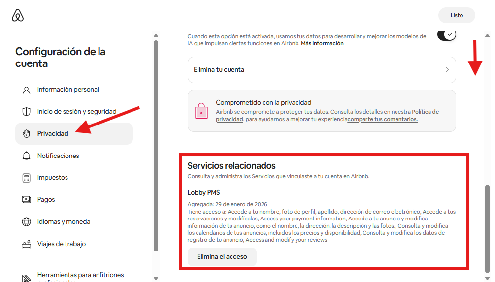 En el menú izquierdo ingresa a Privacidad, prosigue haciendo scroll en el costado derecho hasta bajar y localizar la parte de Servicios Relacionados, debes eliminar el acceso del administrador de servicios que se encuentre ahí, de ser LobbyPMS omite este paso.