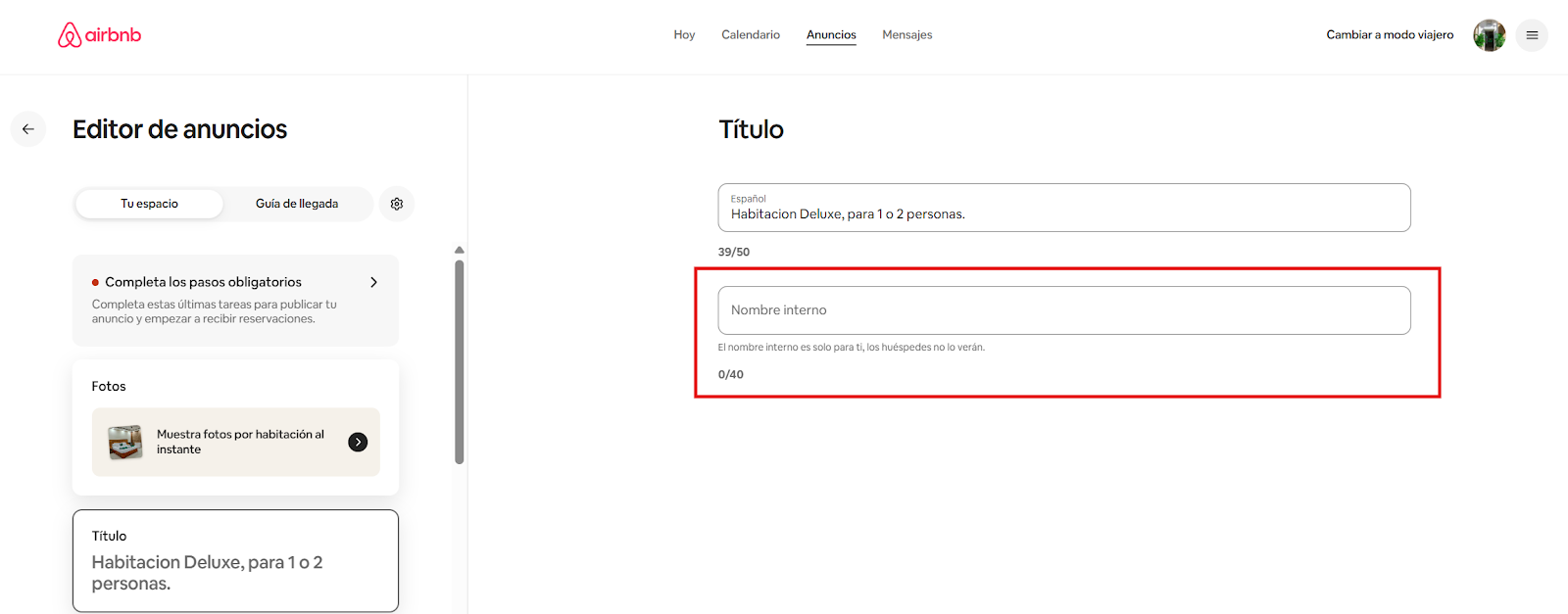 Nota: lo recomendado es que identifiques los anuncios dentro de Airbnb con el mismo nombre de la categoría de Lobby para facilitar el proceso del mapeo. Para ello puedes utilizar la función de “Nombre Interno” dentro del anuncio en Airbnb: