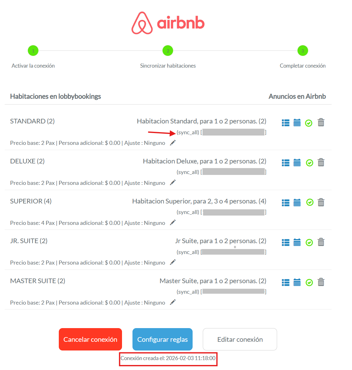 Una vez completes la integración, podrás ver en LobbyBookings el estado de cada anuncio de Airbnb. Allí se mostrará si la sincronización está activa y la fecha en la que se realizó la conexión, lo que te permite confirmar que todo quedó correctamente integrado.