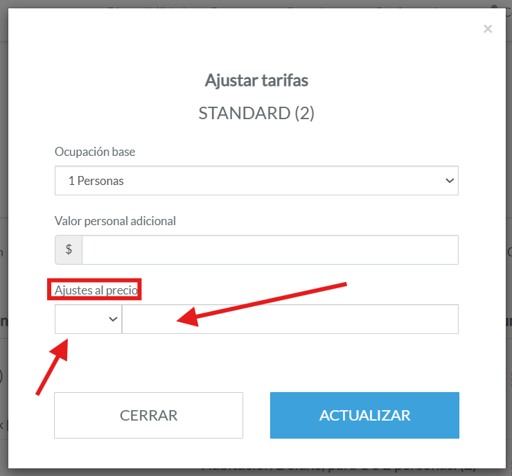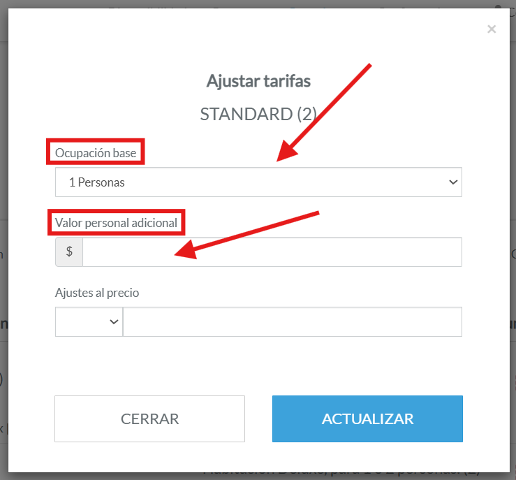 Primero eliges una tarifa base (por ejemplo, 1 persona) y luego defines el valor que se cobrará por cada huésped adicional.