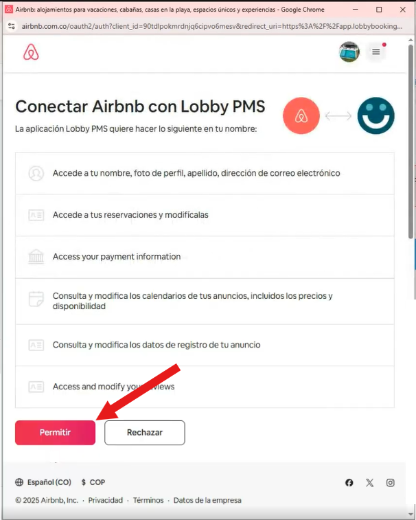 Inmediatamente te va a desplegar una ventana alterna la cual te informará los permisos que está solicitando para gestionar funciones dentro de Airbnb, debes oprimir en Permitir: