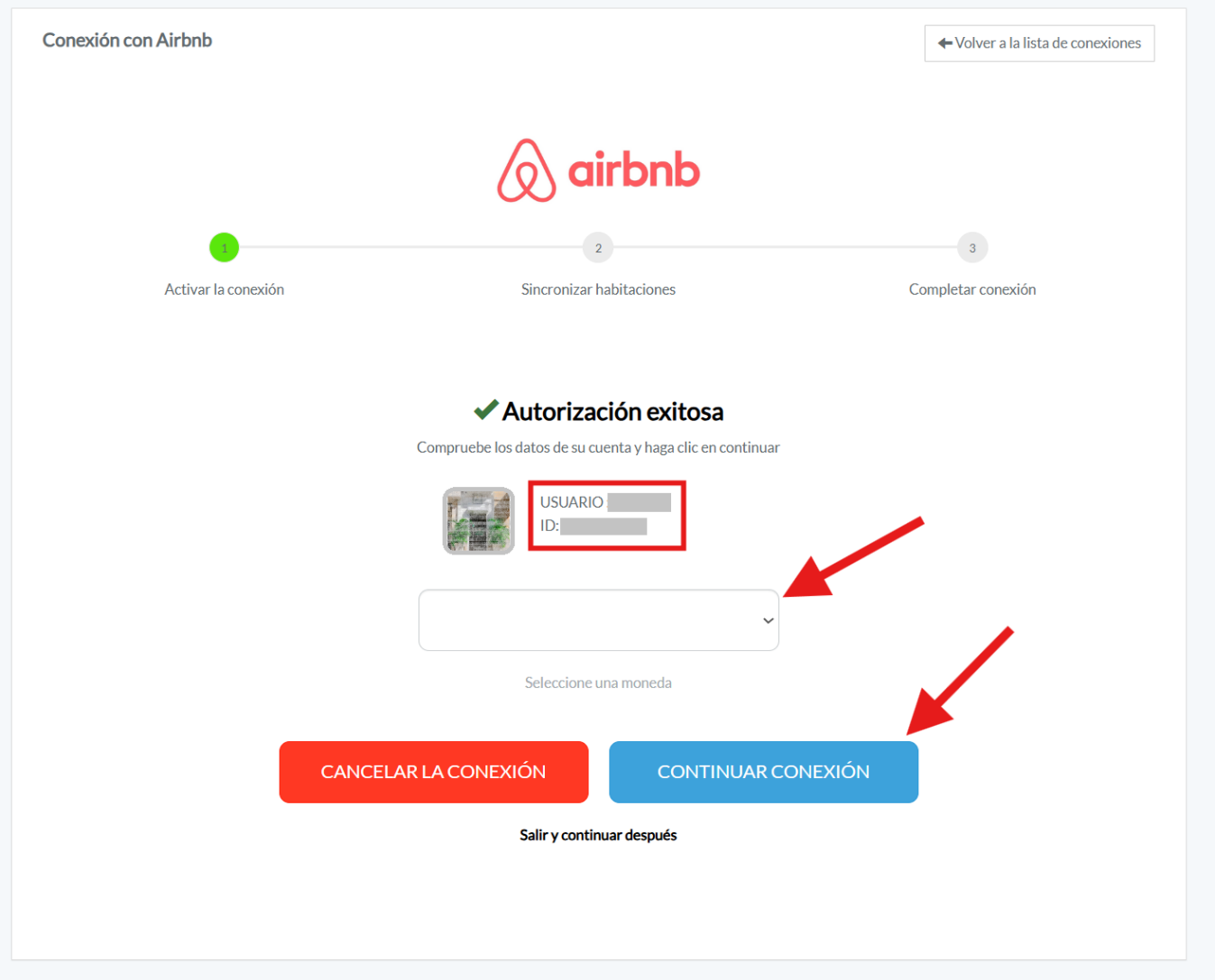 Lo siguiente que verás es la interfaz dónde aparece “autorización exitosa” con los datos del establecimiento, acá debes seleccionar la moneda con la cual trabajas en Airbnb y oprime en continuar conexión: