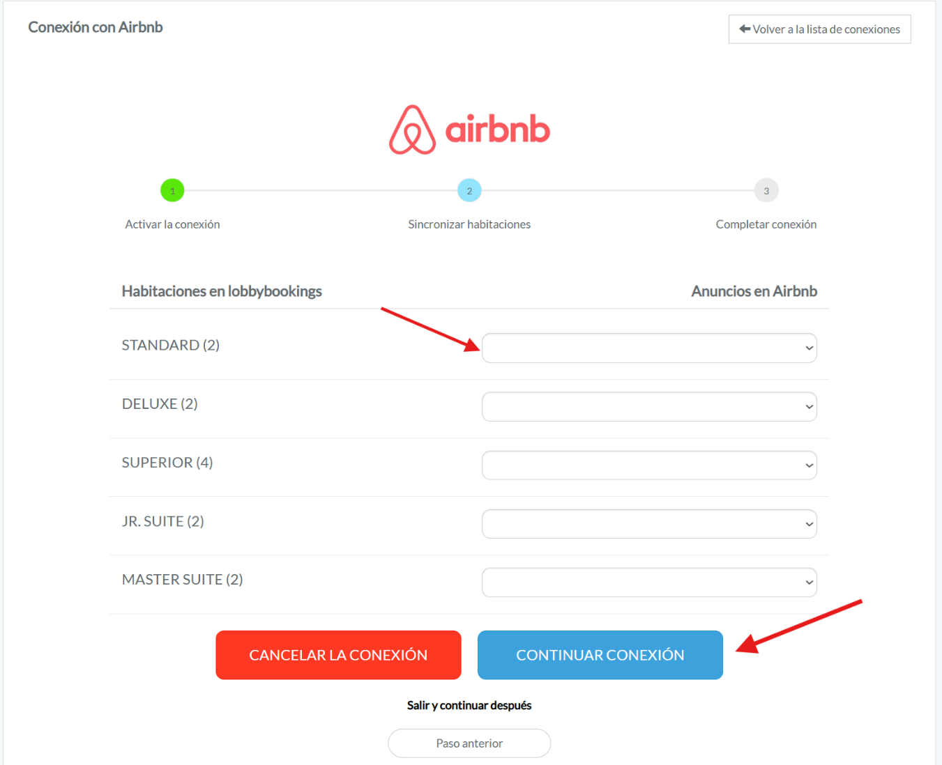 Inmediatamente te dirige al paso del mapeo de anuncios, en el costado izquierdo encontrarás las categorías de habitaciones en LobbyBookings y en el costado derecho anuncios de Airbnb, al culminar el proceso del mapeo oprime en continuar conexión:
