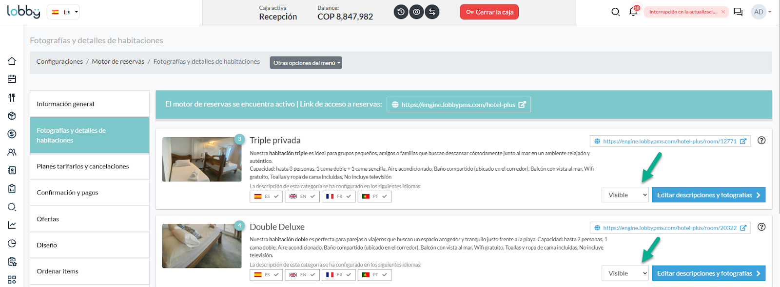 Ruta: Configuraciones → Motor de Reservas → Fotografías y detalles de habitaciones
