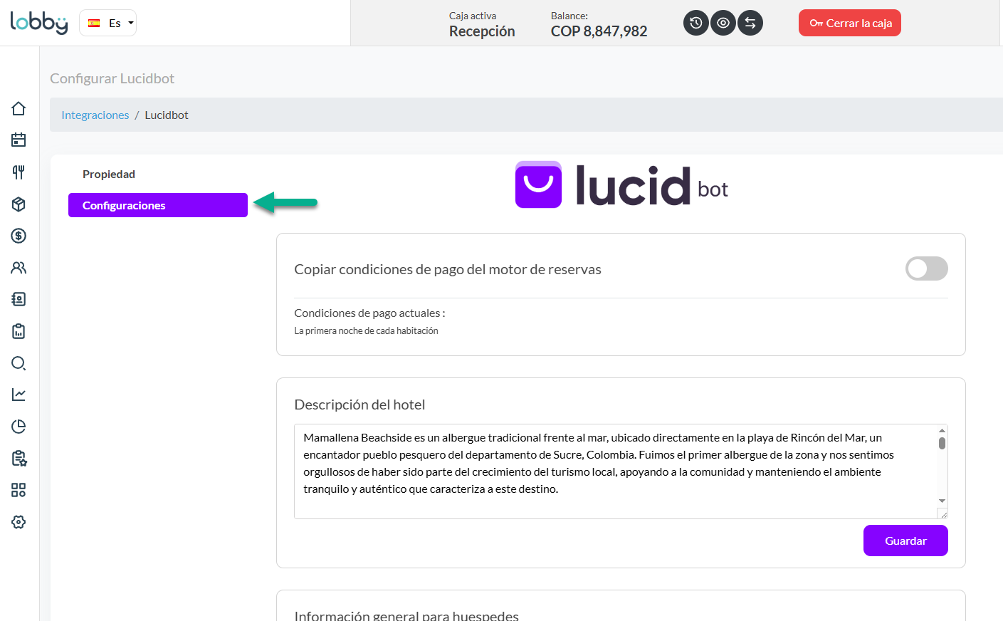Lucidbot utiliza varias configuraciones del Motor de Reservas de LobbyPMS para responder consultas, mostrar habitaciones y generar cotizaciones.