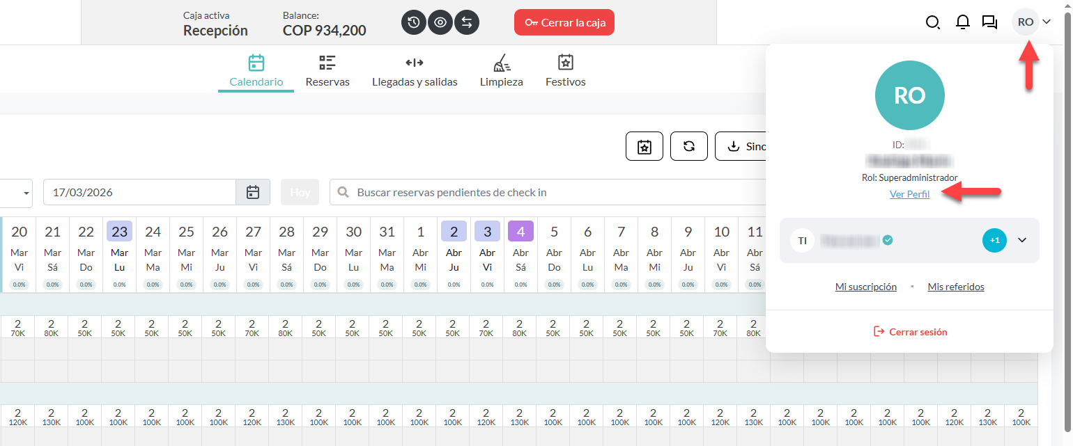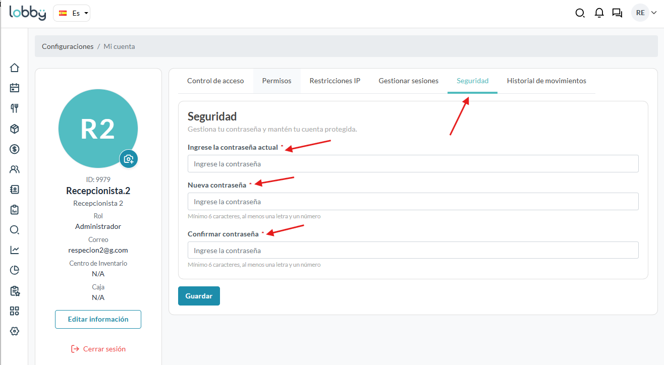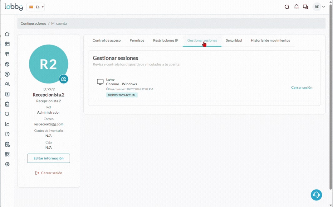 El perfil del usuario en LobbyPMS centraliza las principales opciones de configuración, seguridad y control de accesos de cada usuario dentro de la plataforma.