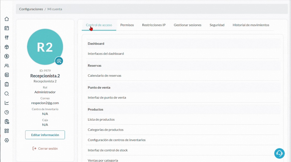 En esta parte podrás visualizar los permisos de acceso actualmente activos en la cuenta, así como los permisos específicos para realizar transacciones según el rol asignado.