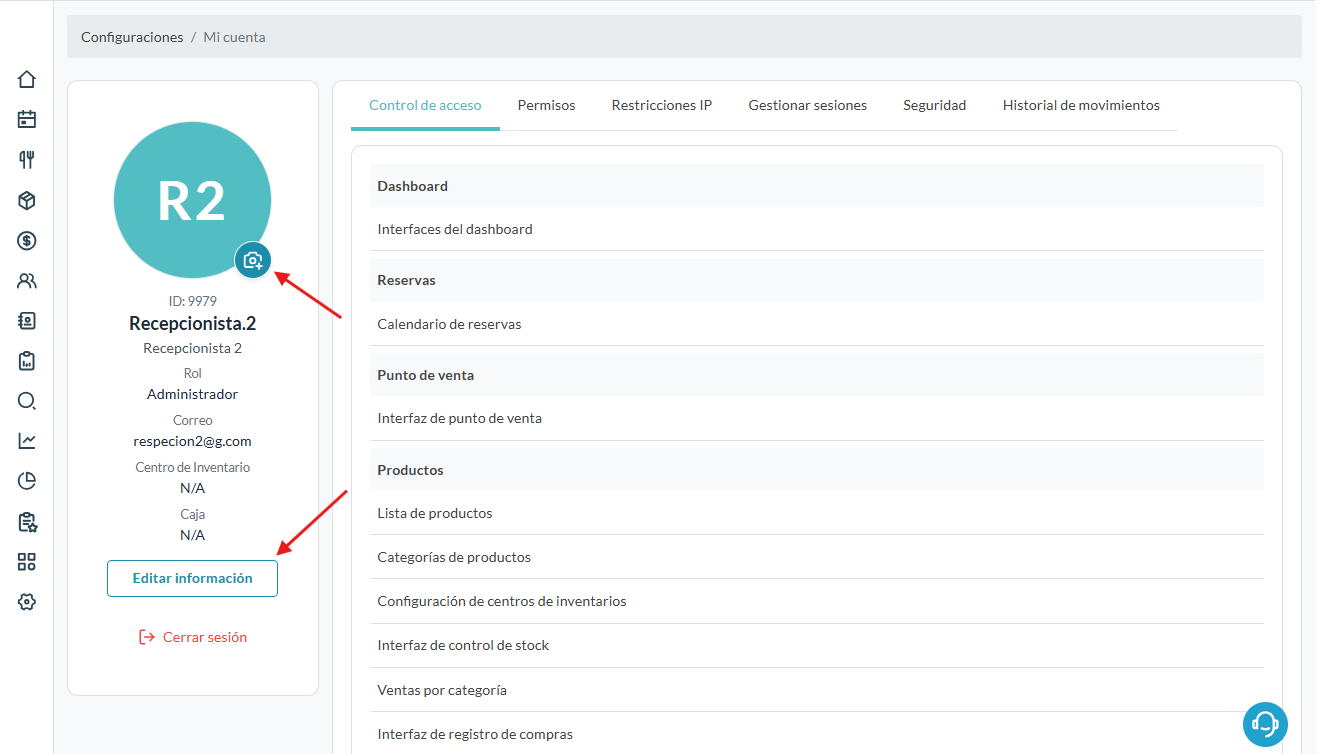 Desde este módulo, ubicado en la parte superior derecha, es posible gestionar información personal, revisar permisos, controlar accesos por IP, administrar sesiones activas, actualizar credenciales y consultar el historial de actividad del usuario.