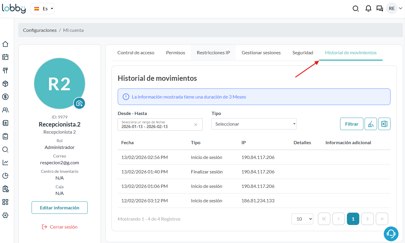 Permite al usuario tener un control exhaustivo sobre los cambios y modificaciones realizados en la plataforma desde su perfil, este control te mostrará movimientos realizados en un periodo máximo de 3 meses.