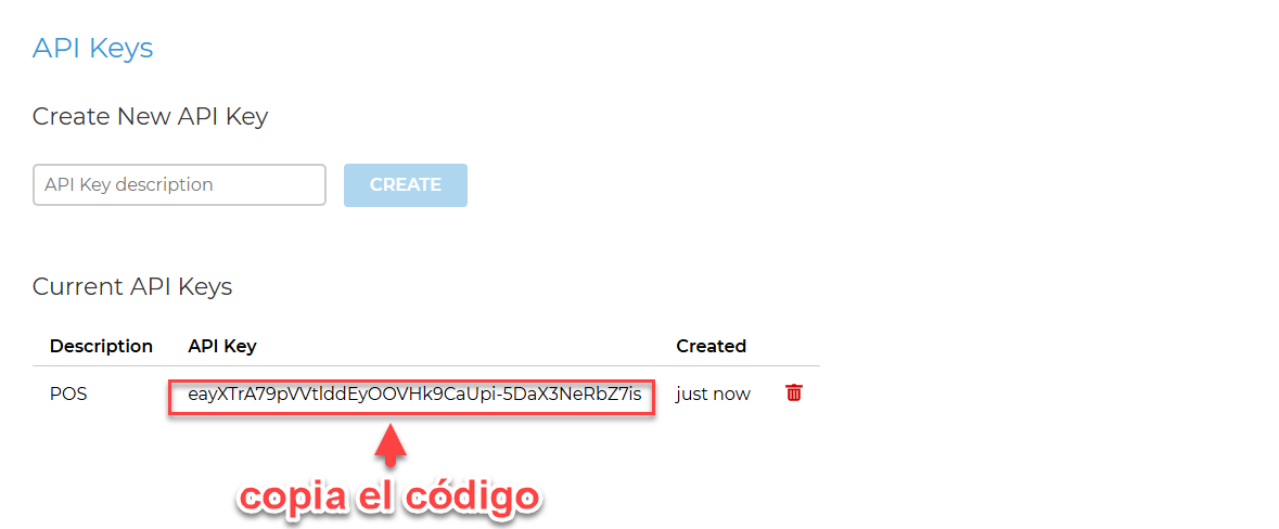 - Al acceder a esta pantalla, asigna un nombre al API. Una vez creado, copia el código generado.