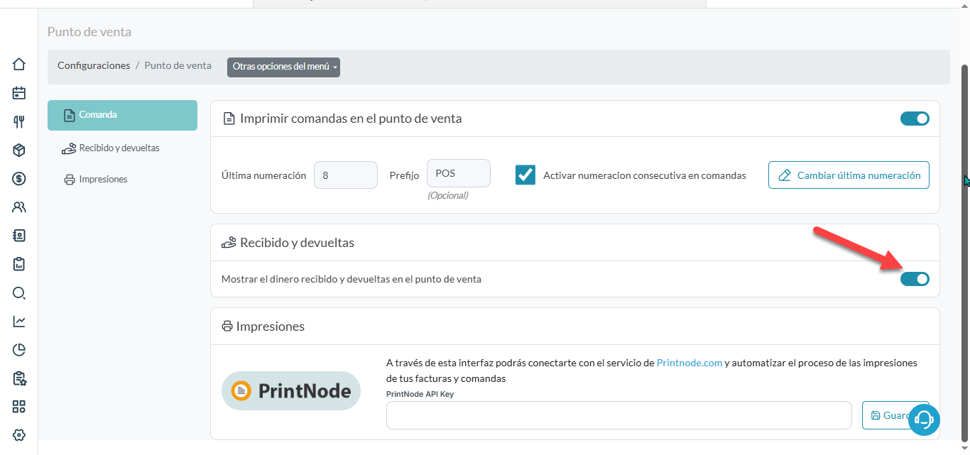 - Active el interruptor de Imprimir comandas en el punto de venta