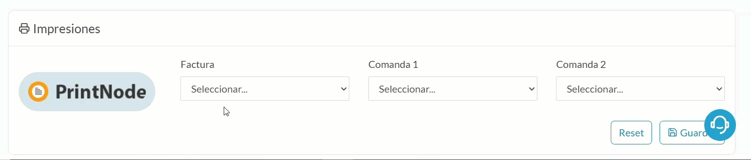 Al hacer clic en "Guardar", aparecerán tres cuadros de selección. En estos, podrás elegir las impresoras reconocidas por PrintNode a las que se enviarán la factura, la comanda 1 y la comanda 2.
